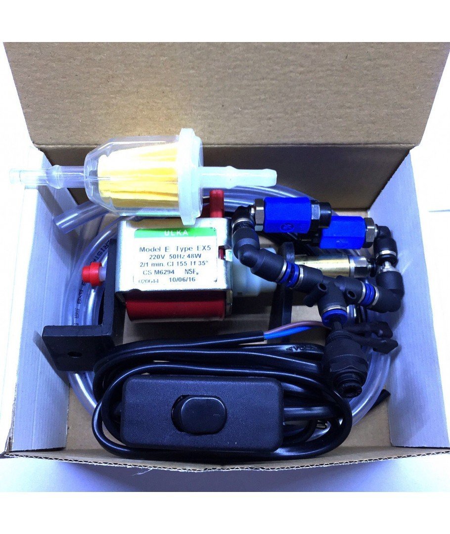 El nuestro consta de Bomba Ulka de 15 bares de presion (la auntentica y genuina), soportes de goma para evitar vibraciones, cable de corriente con interruptor, 2 boquillas completas orientables hacia cualquier angulo, pasamuros, conex en forma de T, 2 metros de tubo de 4 mm. y tubo de admision con filtro incluido, con esta bomba se pueden añadir boquillas hasta un maximo de 20, nuestras boquillas pulverizan muy fino (0,5 litros/hora aprox) en un angulo de 120º y no encharcan el terrario, este kit incluye temporizador por segundos programable hasta un maximo de 9 riegos por dia