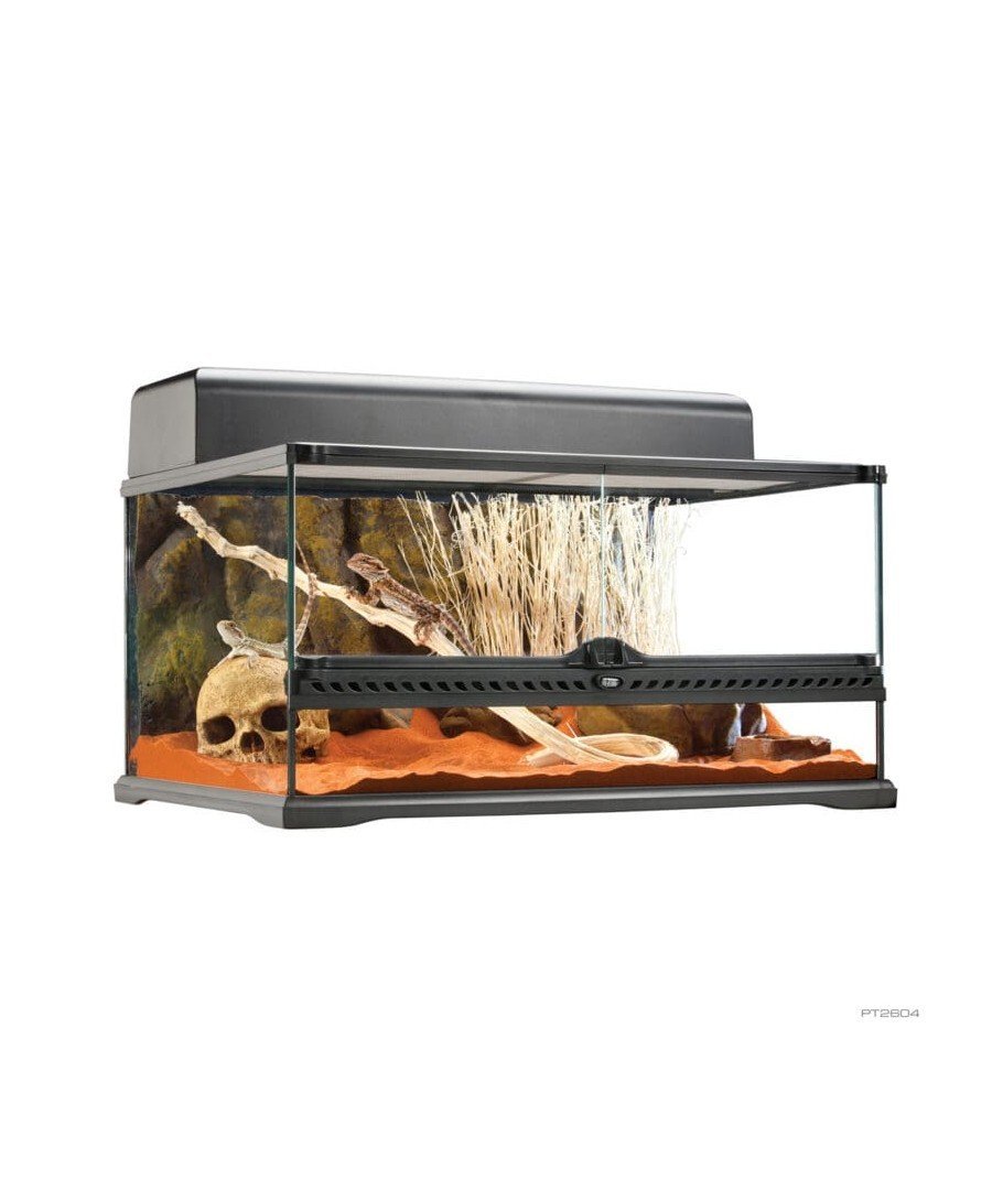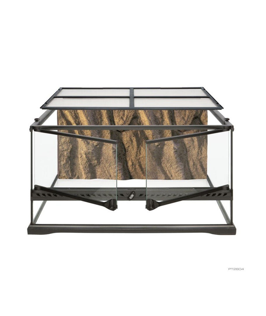 El Terrario de Cristal Exo Terra es el alojamiento ideal para reptiles o anfibios, diseñado por herpetólogos europeos. Las puertas de apertura frontal facilitan el acceso para el mantenimiento y la alimentación. Un cierre especialmente diseñado impide que se escapen los animales y las puertas se pueden abrir por separado. La ventilación por la tapa superior de malla completa permite la penetración de rayos UVB e infrarrojos, y es completamente desmontable para facilitar el acceso a ella a la vez que se decora o limpia. En la parte posterior de la tapa de malla hay 5 entradas de cables/mangueras que se pueden cerrar individualmente a ambos lados para instalar rocas calefactoras, cascadas, sensores, etc. dentro del terrario. La placa inferior del terrario está elevada para montar un calentador de sustrato para calentar una parte de la superficie extendida del suelo. La ventana frontal fija extra alta es ideal para capas gruesas de sustratos (reptiles excavadores), partes acuáticas (paludario) o para montar una cueva. El fondo natural tiene el mismo color que muchos otros artículos de decoración Exo Terra (Cuenco Water Dish, Cascadas, Rocas Heat Wave, etc.) y proporciona una dimensión de escalada adicional.